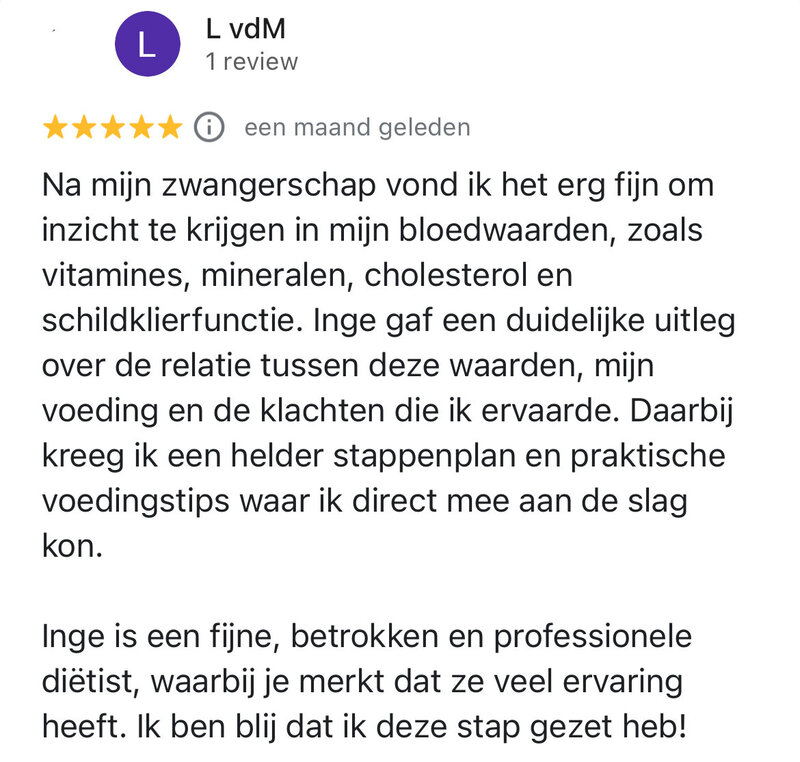 Intake consult (60 min): waarin we je bloedresultaten bespreken en je voeding & leefstijl doornemen om een goed beeld te krijgen van waar je nu staat.