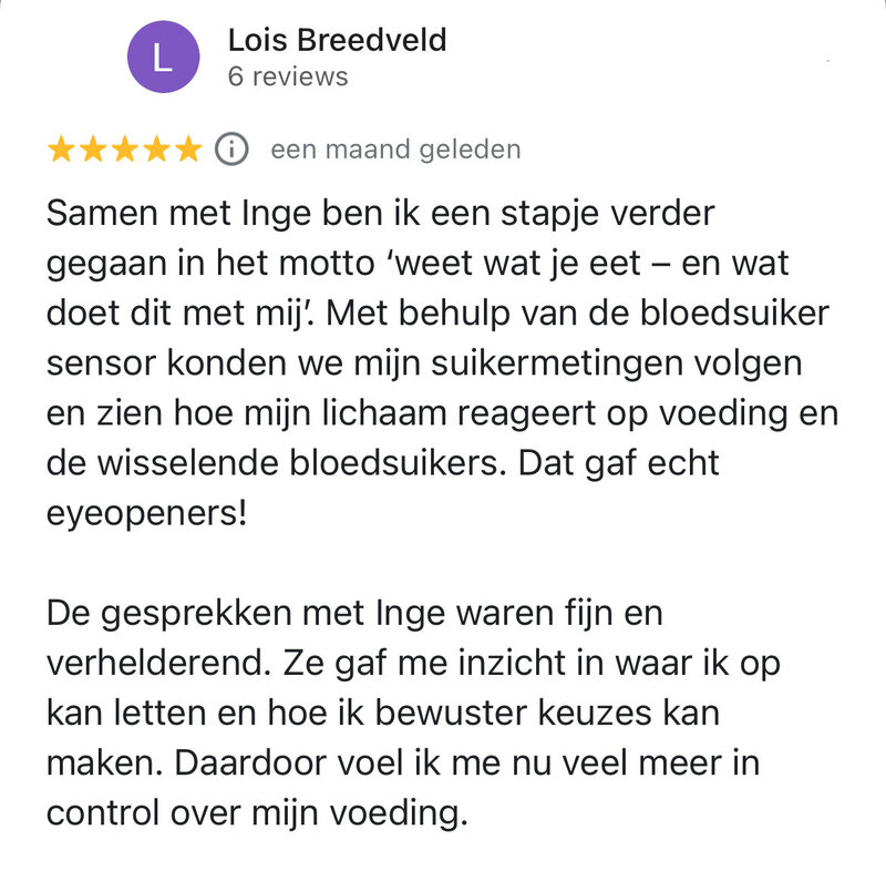 Stap 6. Online Consult 2 (45-min) waarin we de uitkomsten van week 1 met de bloedsuikersensor evalueren. We kijken naar wat goed gaat én naar waar winst te behalen valt, zodat je tijdens week 2 met deze concrete actiepunten aan de slag kan.